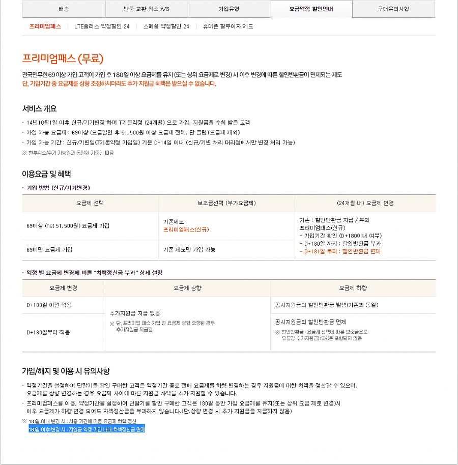 결론, 프리미엄패스 가입회선이 181일이 경과하면, 공시지원금 반환은 해지시점에만 발생하게 되는 것입니다.