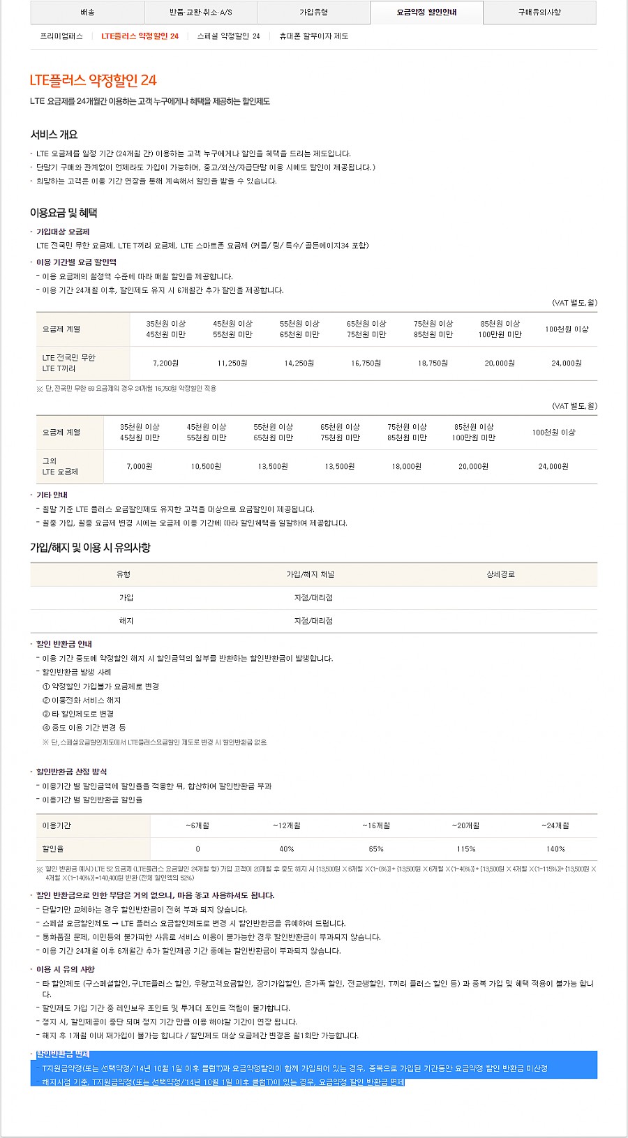 24요금제 이상으로 개통된 회선은 180일 이전 : 공시지원금 전액