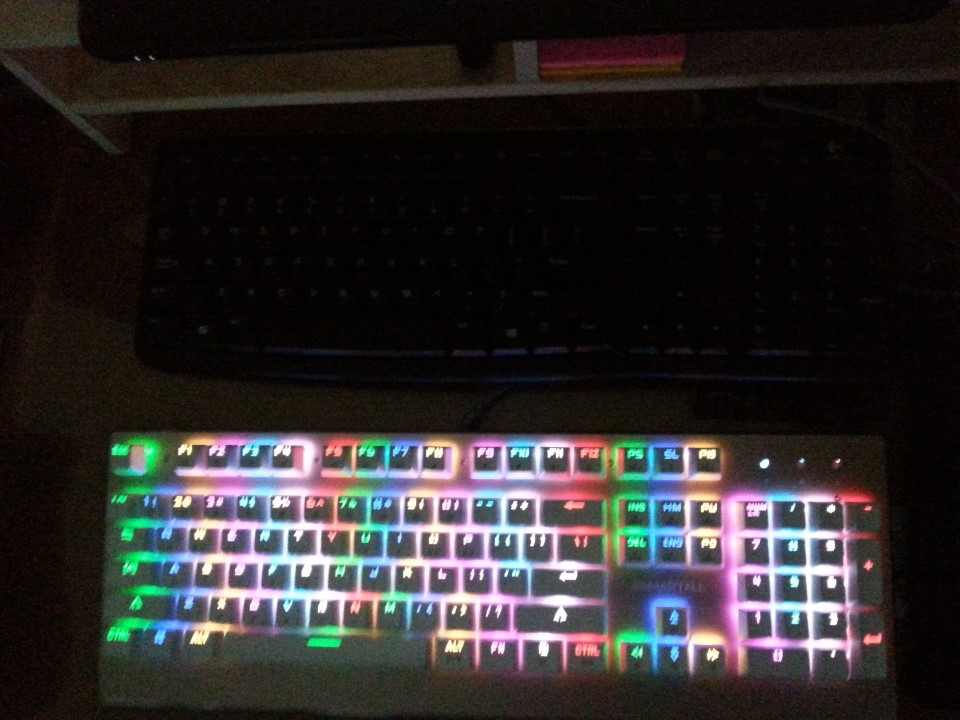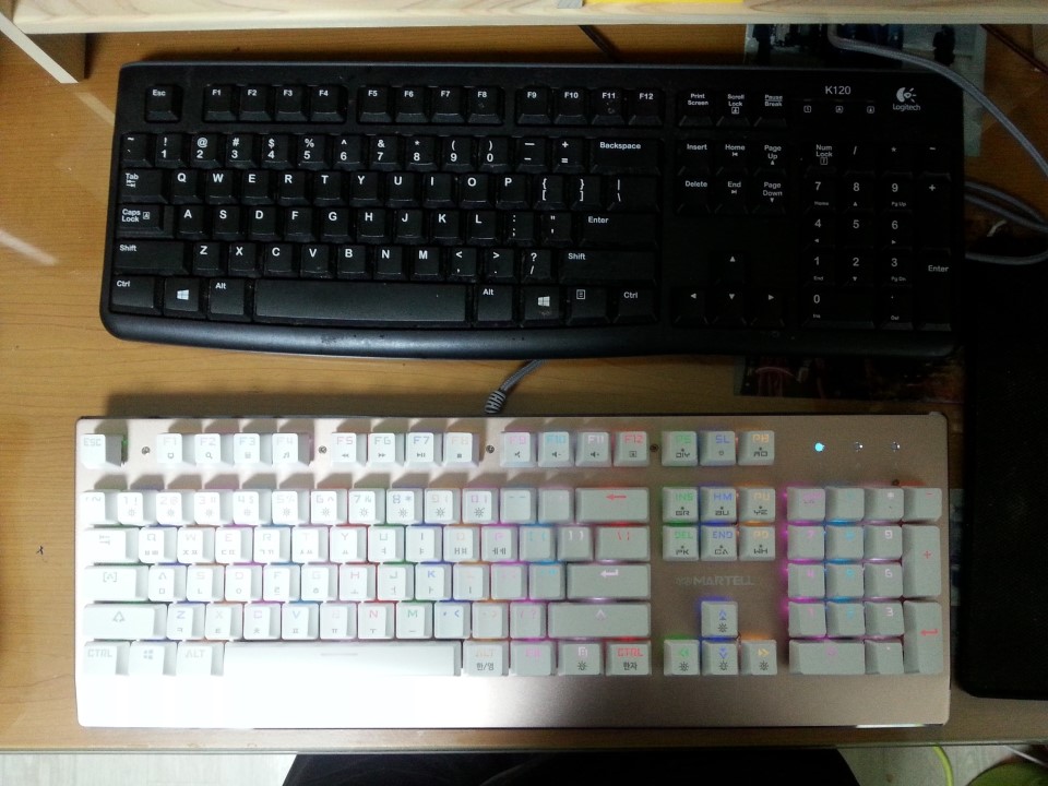 기존에 있던 로지텍 일반키보드와의 크기 비교입니다. 크기는 비슷하거나 약간크며 부담스럽지 않을정도입니다. 키와의 간격도 적당하며 전원을 꼽았을 때의 형형색색 빛나는 색감은 심플한 디자인과 함께 어우러져 멋있는 관경을 만들어냅니다.